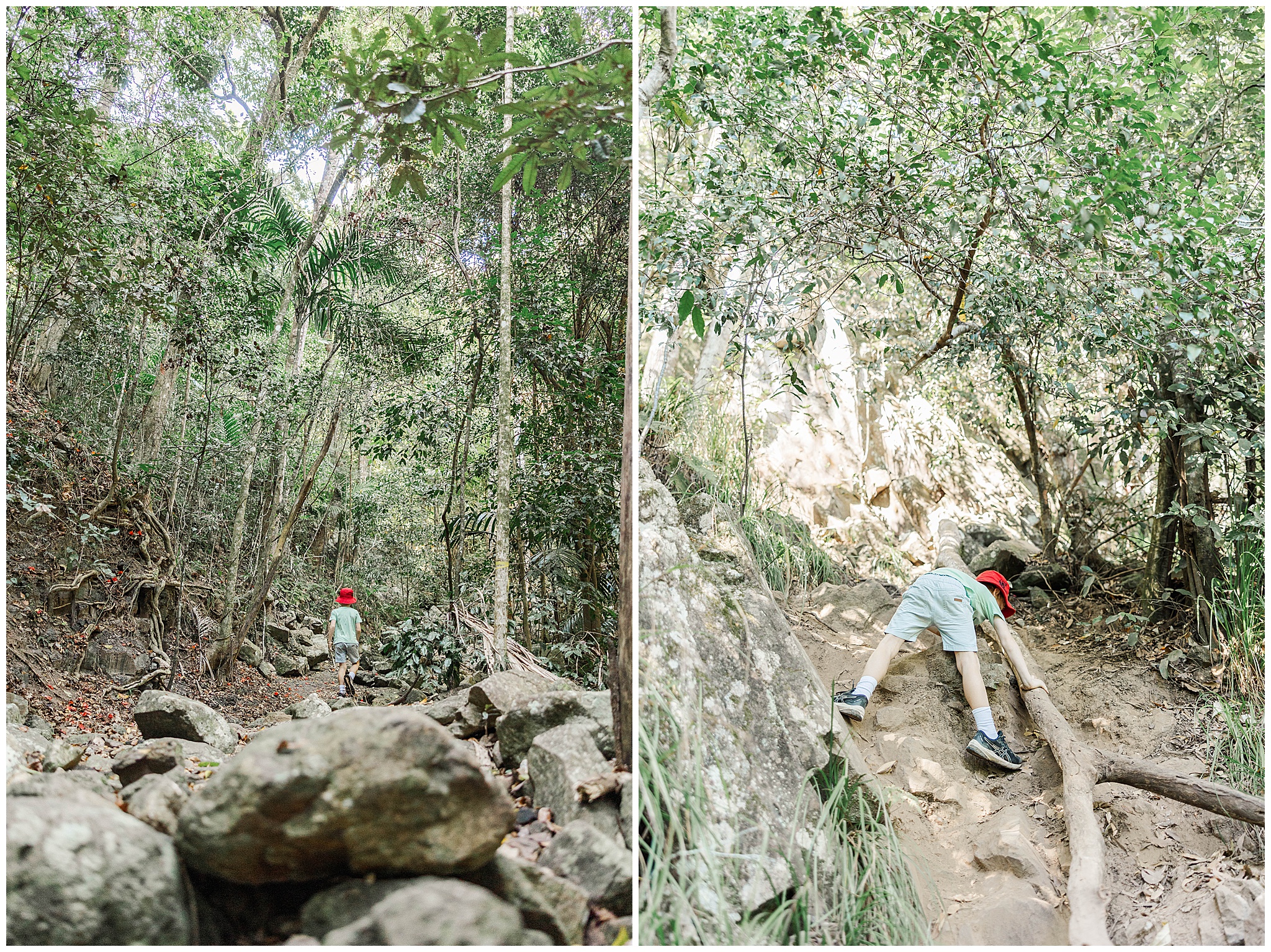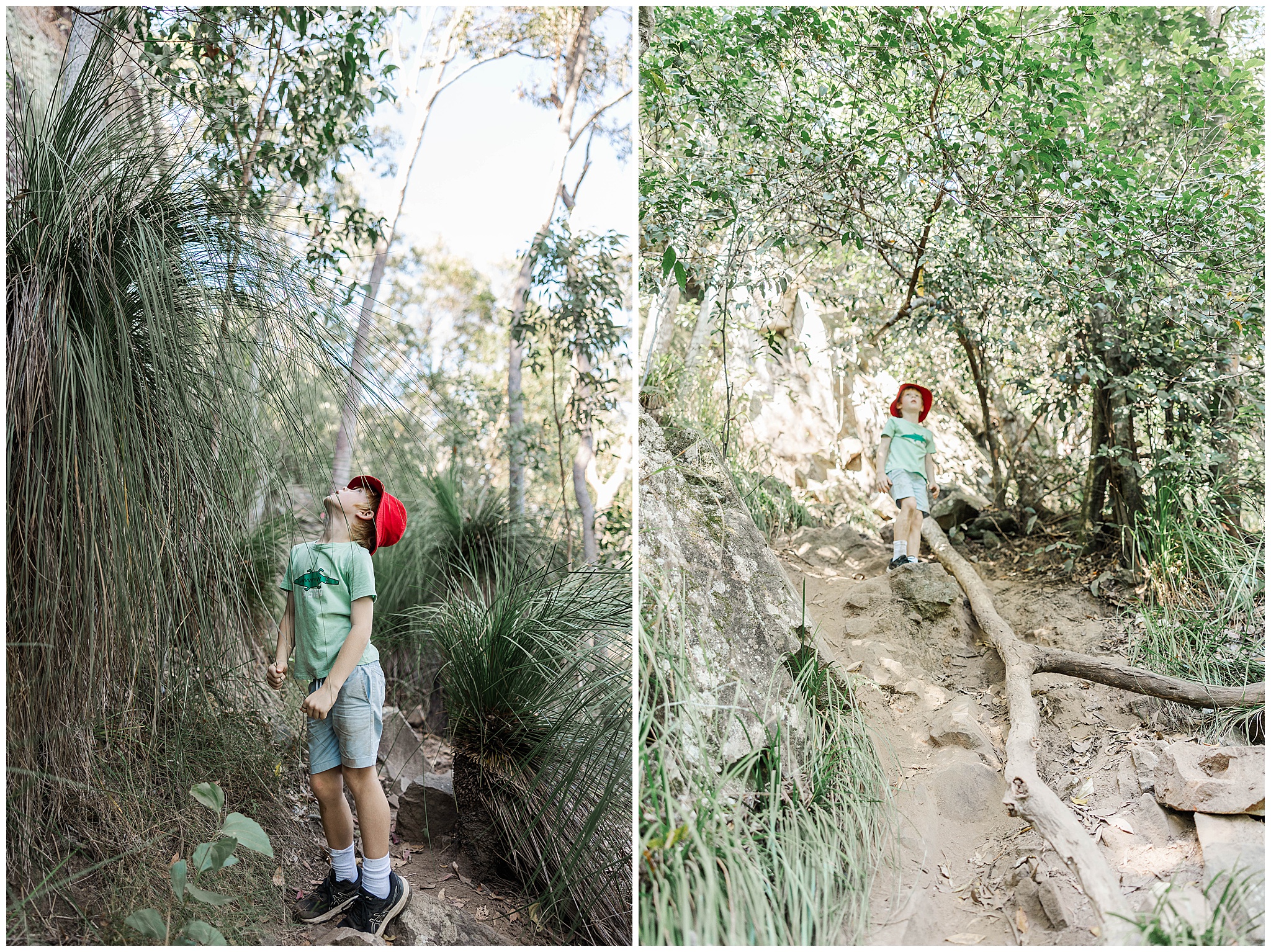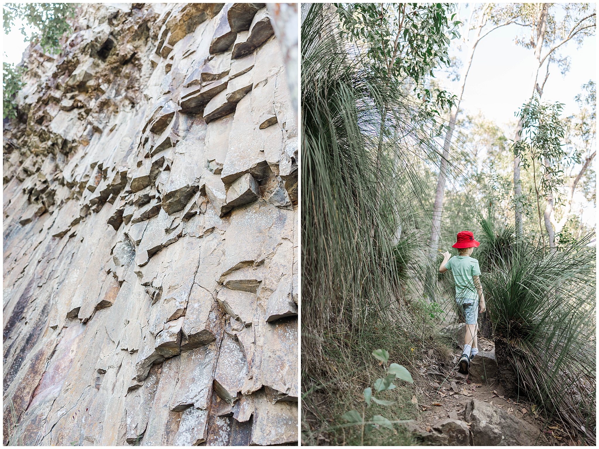 We started the hike by parking the car at The Leap Hotel. With only a short 900m bitchumen walk to the start of the track, it was a great warm up. Also served as a good warm down and to see if the young fella was going to be ok. He was very excited! The trail currently is well used and clearly flagged and marked. You can see 4-5 flags ahead. The track quickly turned to rocks in the dry creek bed. It weaves up and around with a handful of big trees down to squat under. The young fella happily took the lead skipping from rock to rock and weaves among the trees. We were making good time until he saw a wait-a-while – a nightmare from our Eungella hike. So he slowed down keeping a vigil eye for them. We only saw the one and once we got to the sheer rock face he picked up pace to the top. I didn’t mind slowing down to catch my breath.