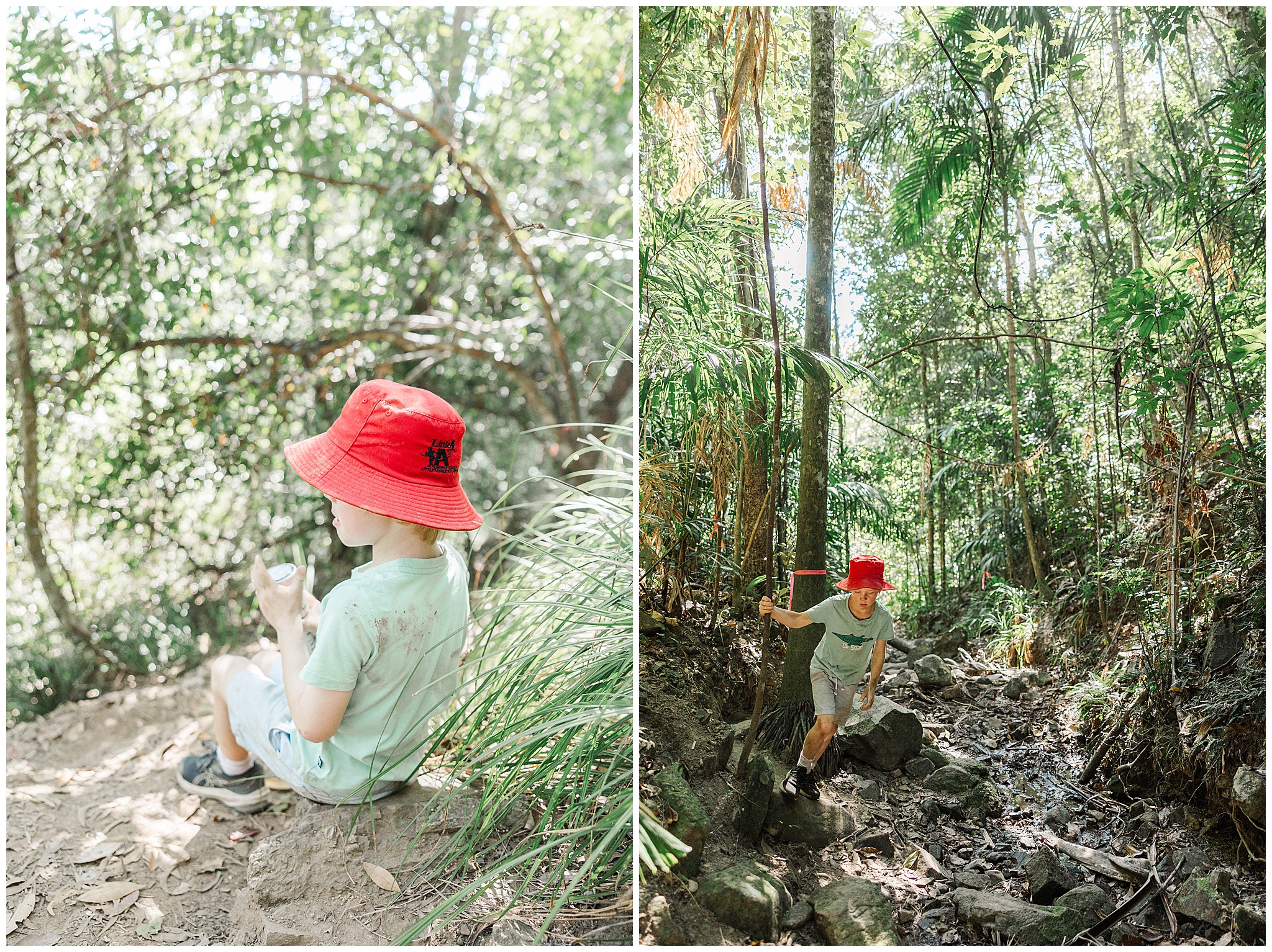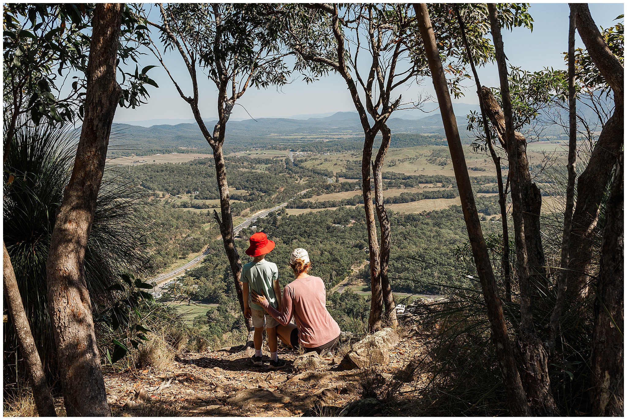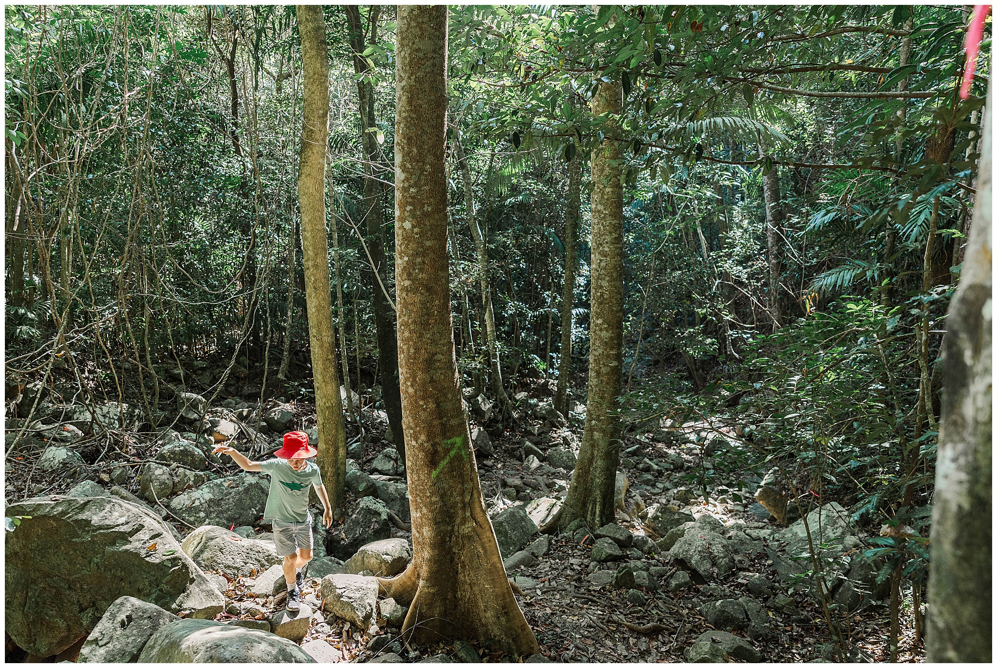 We started the hike by parking the car at The Leap Hotel. With only a short 900m bitchumen walk to the start of the track, it was a great warm up. Also served as a good warm down and to see if the young fella was going to be ok. He was very excited! The trail currently is well used and clearly flagged and marked. You can see 4-5 flags ahead. The track quickly turned to rocks in the dry creek bed. It weaves up and around with a handful of big trees down to squat under. The young fella happily took the lead skipping from rock to rock and weaves among the trees. We were making good time until he saw a wait-a-while – a nightmare from our Eungella hike. So he slowed down keeping a vigil eye for them. We only saw the one and once we got to the sheer rock face he picked up pace to the top. I didn’t mind slowing down to catch my breath.